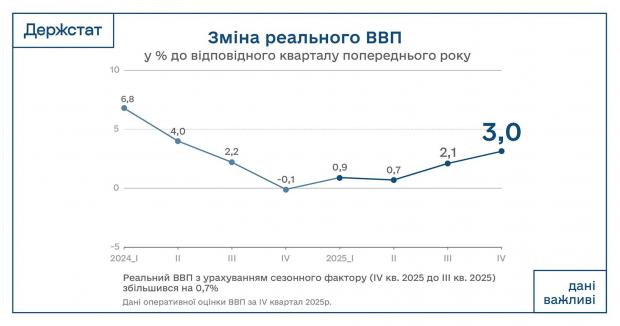 Валовий внутрішній продукт (ВВП) України у четвертому кварталі 2025 року зріс на 3% порівняно з четвертим кварталом 2024 року. Про це повідомила Державна служба статистики 4 лютого, передають Патріоти України. . Зазначається, що порівняно з попереднім...