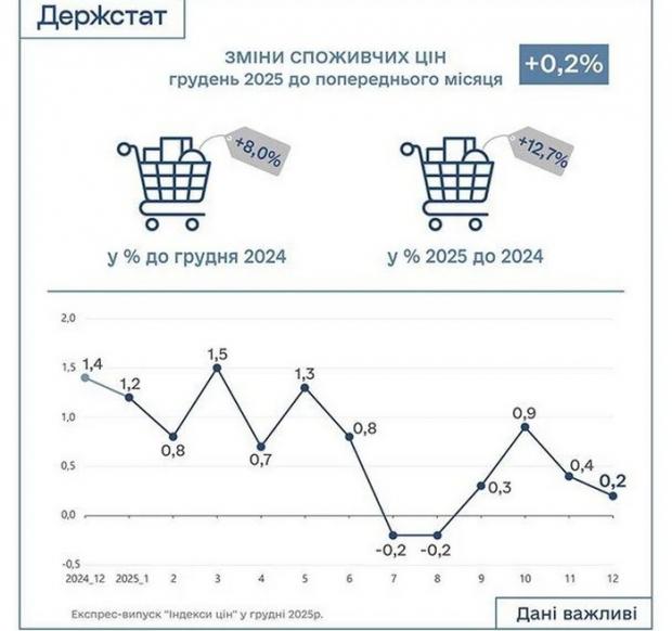 Водночас, за даними офіційної статистики — Державної служби статистики України, базова інфляція з грудня 2024-го по грудень 2025-го була в 1,5 раза нижчою — всього 8%. Загалом за грудень зростання цін склало лише 0,1%, причому найбільше подорожчали яйця, хліб, риба, сало, овочі, соняшникова олія — на них ціна зросла від 0,7 до 5,6%. На 0,2−4,1% подешевшали фрукти, м'ясо птиці та свинина, цукор, рис і вершкове масло.