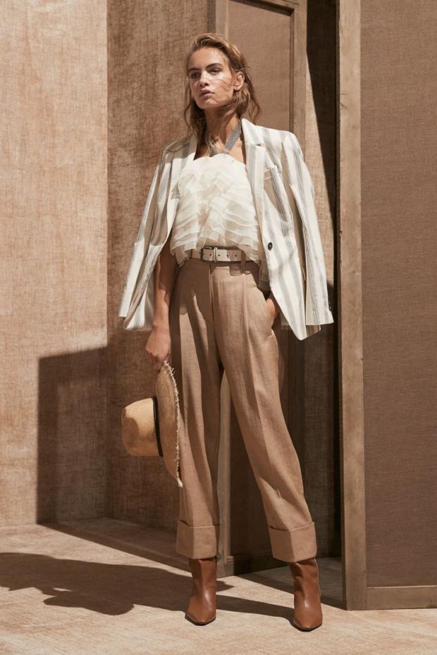 Бренд віддає перевагу класичним силуетам, які виходять за межі сезонних трендів. Моделі універсальні і призначені для того, щоб органічно вписатися у вишуканий гардероб. Це м'які кашемірові светри, брюки класичного крою і плавні пальта в нейтральних тонах. Кожен предмет одягу демонструє ретельну увагу до деталей і часто виготовляється вручну в італійському місті Соломео. Акцент робиться на розкішних матеріалах, таких як високоякісний кашемір, тонка вовна, шовк і льон. Шви, крій і драпірування ретельно продумані, щоб підвищити комфорт і стиль. Характерні кольори: бежевий, кремовий, коричневий, м'який сірий та приглушені землисті тони. Рідкісні вкраплення стриманих кольорів, таких як теплі пастельні або припудрені блакитні, додають глибини, не порушуючи елегантності. Палітра відображає спокійний, вишуканий стиль життя, а не показну розкіш. Естетика поєднує офіційний та повсякденний стилі таким чином, що це виглядає природно. Цей повсякденний люкс втілює комфорт без шкоди для стилю. Логотипи та брендові позначки мінімальні, що дозволяє зосередити увагу на матеріалі, крої та загальному вигляді. Це підкреслює ідею, що розкіш не потребує гучних заяв — вона тихо говорить через якість.