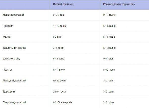 Науковці розробили рекомендований час сну для різних вікових груп. У кожній групі представлено рекомендований діапазон тривалості нічного сну для здорових людей. У деяких випадках спати на годину більше або менше загального діапазону може бути прийнятним залежно від обставин.