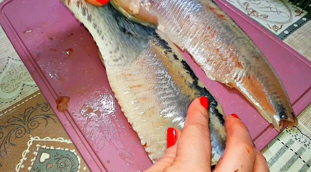 Перш за все відріжте хвіст оселедця та його голову. Це відкриє вам доступ усередину. Потім візьміть рибину у праву руку і покладіть в напрямку до хвоста. Тепер великий палець покладіть на сам хребет біля основи під м’ясо. Після цього просувайте його до хвоста.