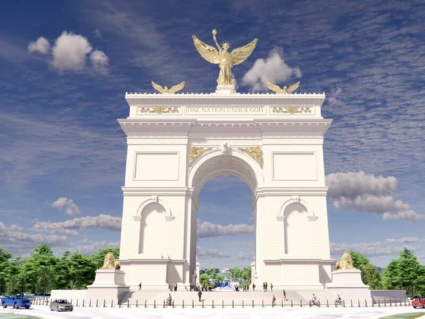 На візуалізаціях арки зображено золотий напис "One Nation Under God" ("Єдина нація під покровительством Бога") із двома золотими орлами і статуєю Свободи із золотими крилами. На постаменті встановлять статуї золотих левів.
