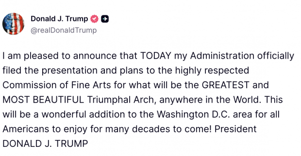 За його словами, Білий дім подав план комісії з образотворчого мистецтва, яка розгляне пропозицію наступного тижня. Трамп назвав майбутню арку "найвеличнішою та найкрасивішою Тріумфальною аркою в усьому світі".