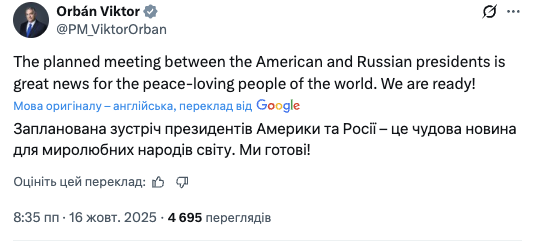 Орбан наголосив, що його країна готова прийняти Дональда Трампа та Володимира Путіна, які мають обговорити закінчення війни. «Запланована зустріч між президентами США і Росії – це чудова новина для миролюбних людей усього світу. Ми готові!» – написав він.