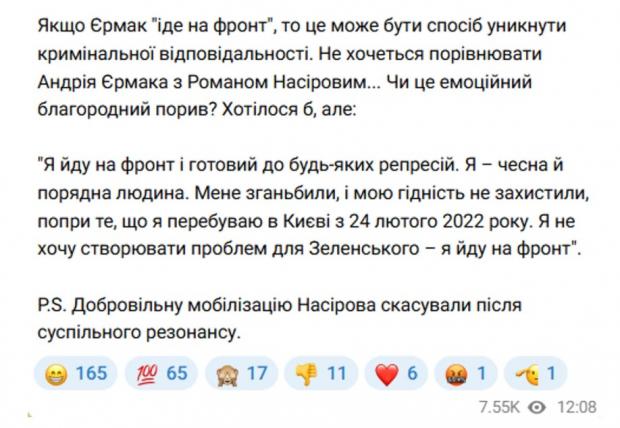Парламентарка заявила, що екскерівник ОП таким чином може намагатися "уникнути відповідальності". "Якщо Єрмак "іде на фронт", то це може бути спосіб уникнути кримінальної відповідальності. Не хочеться порівнювати Андрія Єрмака з Романом Насіровим… Чи це емоційний благородний порив?" — написала Безугла.