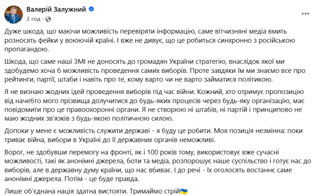 «Дуже шкода, що маючи можливість перевіряти інформацію, саме вітчизняні медіа вмить розносять фейки у воюючій країні. І вже не дивує, що це робиться синхронно з російською пропагандою. Шкода, що саме наші ЗМІ не доносять до громадян України стратегію, внаслідок якої ми здобудемо хоча б можливість проведення самих виборів. Проте завдяки їм ми знаємо все про рейтинги, партії, штаби і навіть про те, кому варто чи не варто займатися політикою», – йдеться у дописі.