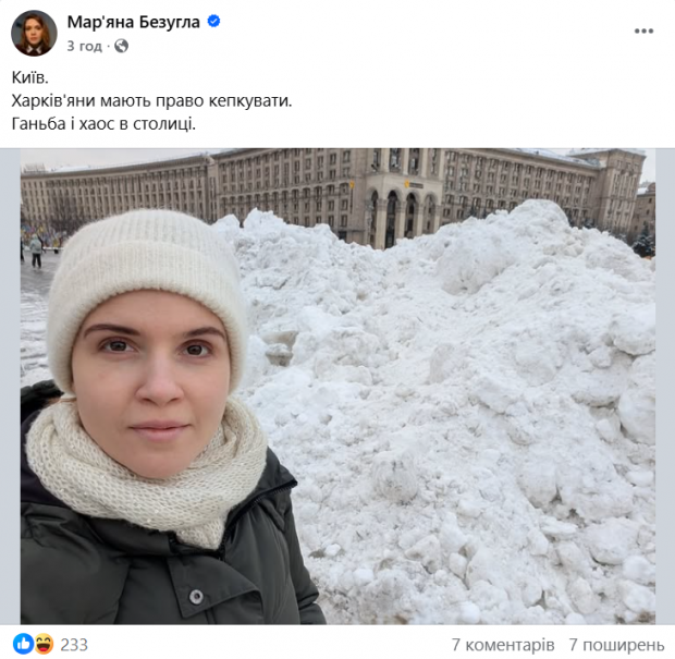 «Київ. Харків'яни мають право кепкувати. Ганьба і хаос в столиці», – написала Безугла.