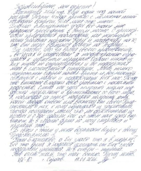 Священик також пише, що відсутність підтримки породжує відчуття забутості, яке, за його словами, посилюється умовами ув’язнення. Наприкінці листа він просить молитов.