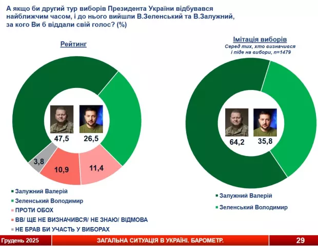 Якщо б президентські вибори відбулися найближчим часом і у них брали участь нинішній посол України в Британії генерал Валерій Залужний і президент Володимир Зеленський, то вони обидва пройшли б у другий тур. Hезультати дослідження проведеного 12 – 18 грудня 2025 року компанією "SOCIS", передають Патріоти України.