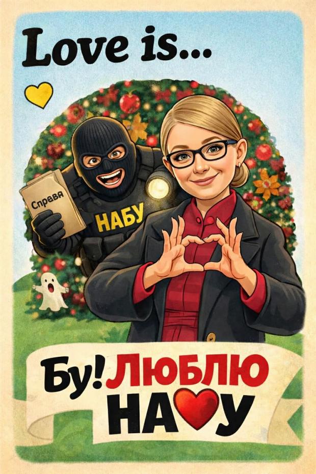 На картинці зображений спецпризначенець у формі з написом «НАБУ». У руках він тримає папку, на якій зазначено «Справа». На фоні цього стоїть жінка в окулярах, у якій легко впізнати Юлію Тимошенко. Вона склала із пальців сердечко. Картину доповнює підпис: «Бу! Люблю НАБУ».