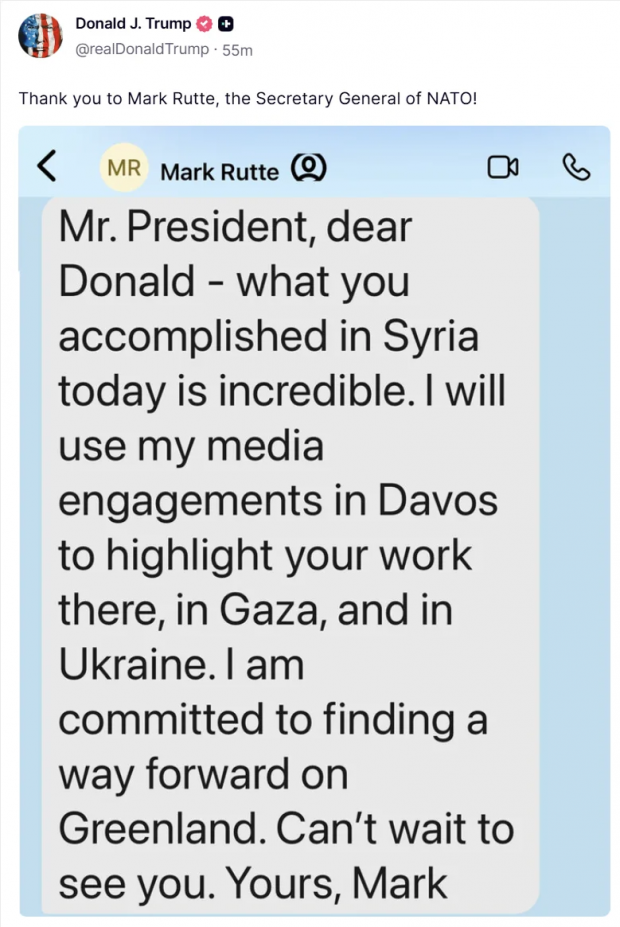 Згодом Трамп в черговому дописі в Truth Social виклав у вільний доступ повідомлення від Рютте наступного змісту: