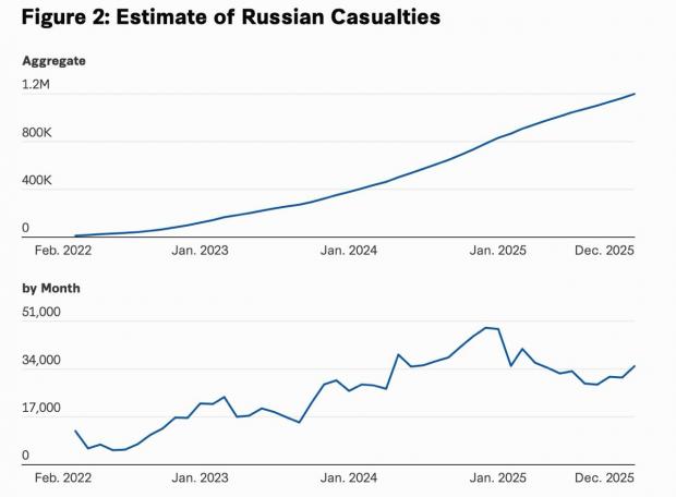 Лише за 2025 рік війська РФ втратили 425 тисяч убитими й пораненими, тобто в середньому близько 35 тисяч щомісяця. Загалом із початку вторгнення до 315 тисяч російських військових було вбито — це співставно з населенням таких міст, як Смоленськ, Бєлгород або Чита.