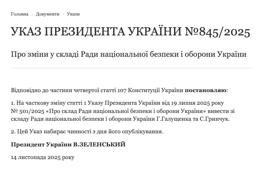Президент Володимир Зеленський підписав указ про зміни у складі Ради національної безпеки та оборони. Про це повідомляють Патріоти України з посиланням на указ №845/2025.