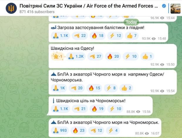 Повітряні сили ЗСУ попереджали про загрозу застосування балістичного озброєння з півдня, а також про рух швидкісних цілей у бік Одеси й Чорноморська.