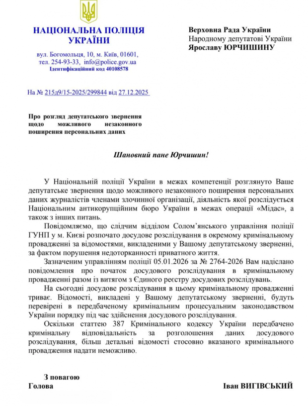 Солом’янське управління поліції Києва розпочало кримінальне провадження щодо можливого стеження за журналістами з боку фігурантів корупційної справи Мідас. Про це повідомив у четвер, 8 січня, народний депутат від фракції Голос, голова комітету Верховної Ради з питань свободи слова Ярослав Юрчишин, передають Патріоти України.