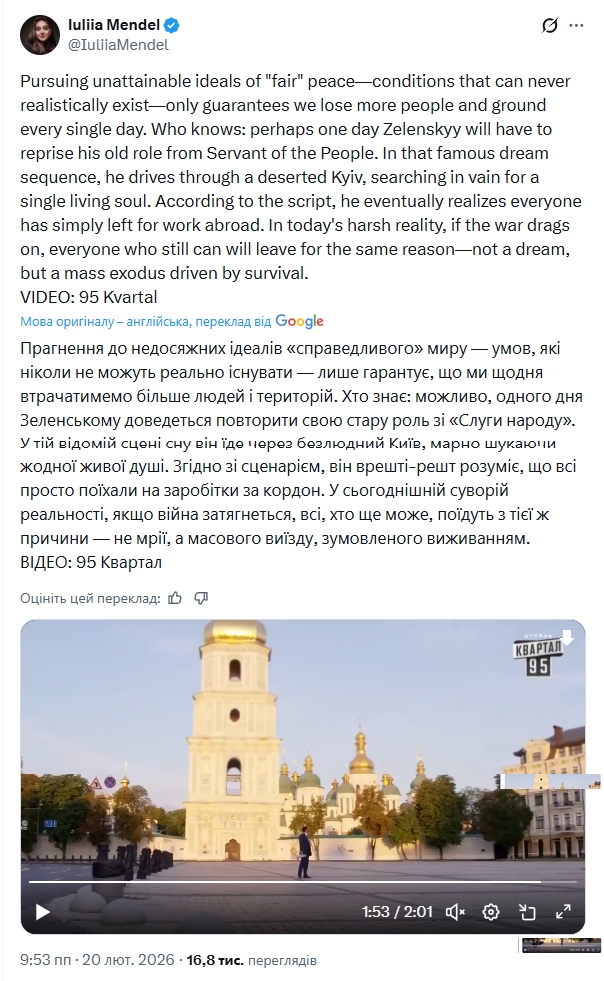 "Прагнення до недосяжних ідеалів "справедливого» миру — умов, які ніколи не можуть реально існувати — лише гарантує, що ми щодня втрачатимемо більше людей і територій. Хто знає: можливо, одного дня Зеленському доведеться повторити свою стару роль зі "Слуги народу", - написала Мендель та опублікувала епізод з відомого серіалу 2015 року в якому герой Володимира Зеленського, вчитель Василь Голобородько, стає президентом України.