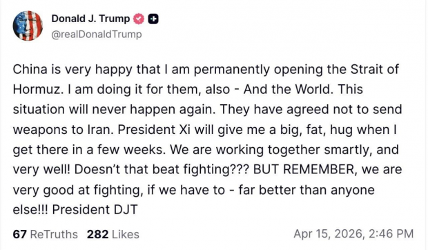 «Китай дуже радіє, що я назавжди відкрию Ормузьку протоку. Я роблю це для них — і для всього світу. Ця ситуація ніколи не повториться. Вони [Китай] погодились не надсилати Ірану зброю. Президент Сі міцно мене обійме, коли ми побачимося за кілька тижнів», — йдеться у дописі Трампа.