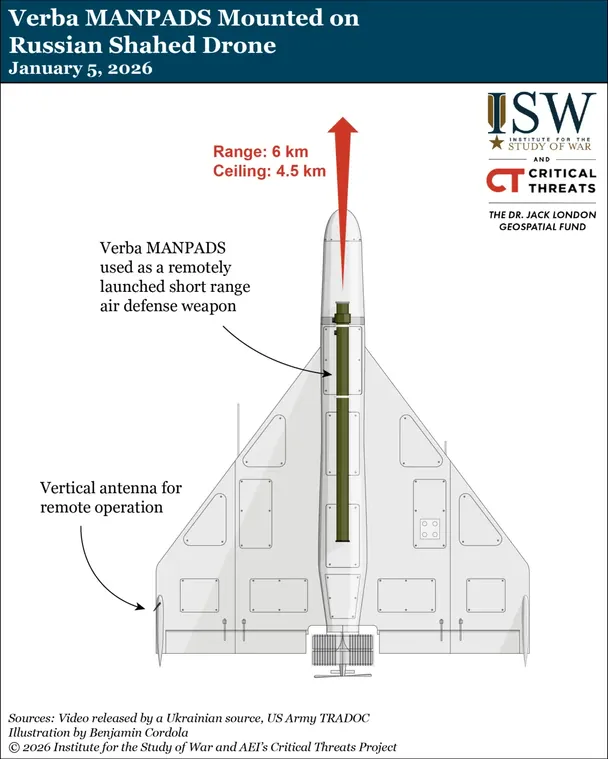 Американські аналітики згадують опубліковані зображення і відео українського фахівця зі зв’язку Сергія «Флеша» Бескрестнова, на яких показано збитий Shahed, оснащений переносним зенітно-ракетним комплексом. За його даними, війська РФ вперше застосували модифіковані дрони вночі проти 4 січня.