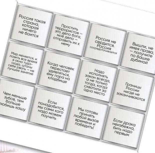 Як повідомив спецпредставник Путіна, цукерки було подаровано в рамках діалогу Росії та США. На солодощах зібрано «найкращі» цитати російського диктатора Крім того, на коробці, ймовірно, натяк для США, оскільки написано: «Вести диалог с Россией с точки зрения силы - бессмысленно».