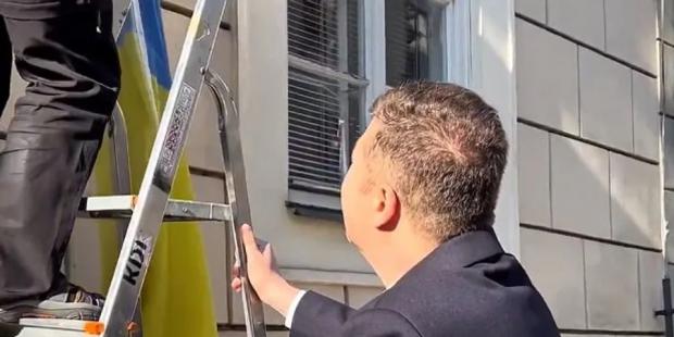 На записі видно, як Окамура тримає драбину для чоловіка, що знімає український прапор з фасаду будівлі.