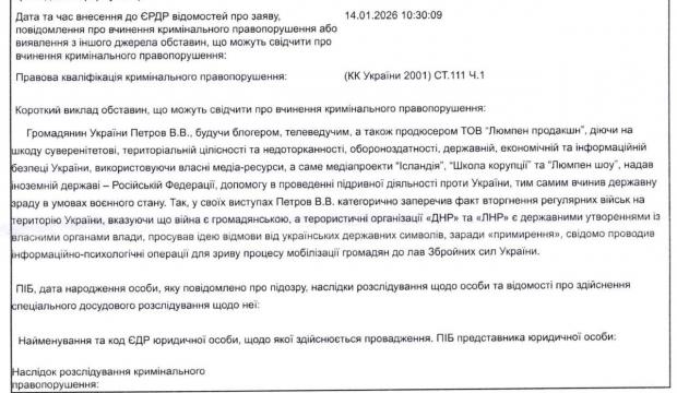 «Громадянин України Петров Володимир Володимирович, будучи блогером, телеведучим, а також продюсером ТОВ «Люмпен продакшн», діючи на шкоду суверенітетові, територіальній цілісності та недоторканності, обороноздатності, державній, економічній та інформаційній безпеці України, використовуючи власні медіа-ресурси, а саме медіапроєкти «Ісландія», «Школа корупції» та «Люмпен шоу», надав іноземній державі – Російській Федерації, допомогу в проведенні підривної діяльності проти України, тим самим вчинив державну зраду в умовах воєнного стану
