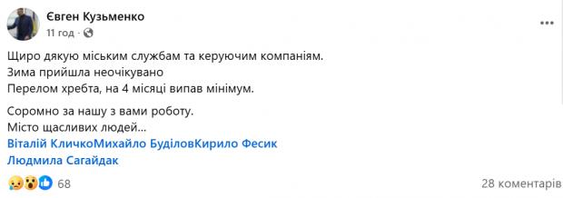 "Щиро дякую міським службам та керуючим компаніям. Зима прийшла неочікувано", — написав депутат.