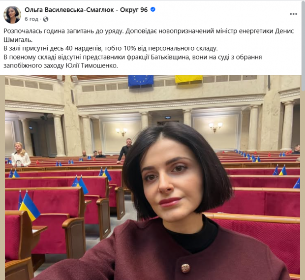 «Розпочалась година запитань до уряду. Доповідає новопризначений міністр енергетики Денис Шмигаль. В залі присутні десь 40 нардепів, тобто 10% від персонального складу. В повному складі відсутні представники фракції «Батьківщина», вони на суді з обрання запобіжного заходу Юлії Тимошенко», – розповіла нардепка.