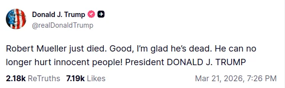 «Роберт Мюллер щойно помер. Добре, я радий, що він мертвий. Він більше не може завдавати шкоди невинним людям!» — сказано в публікації Трампа.