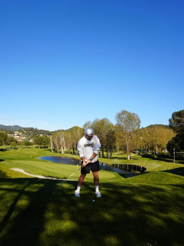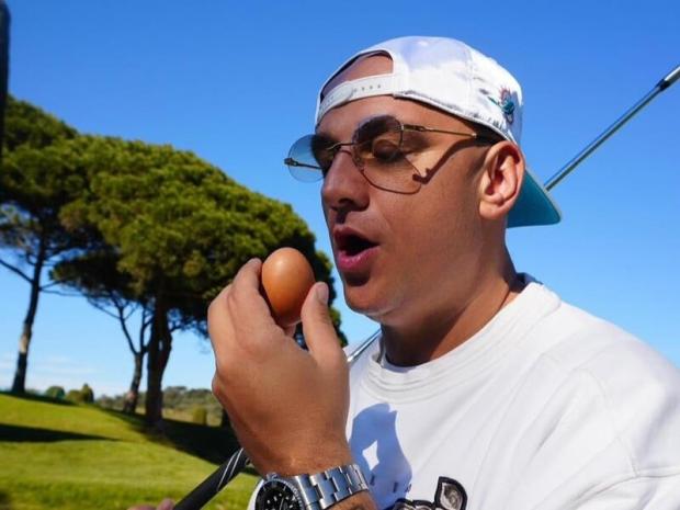 На знімках він позує у світшоті, шортах і кепці. В одній руці він тримав яйце.