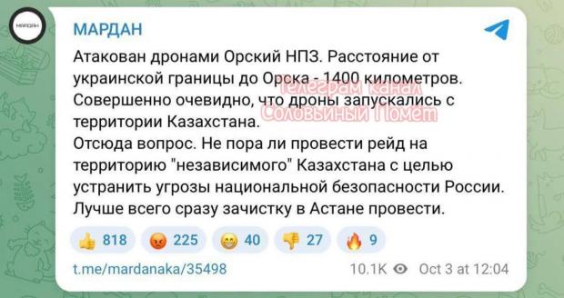 Російський медіа-фігурант і пропагандист Сергій Мардан опублікував у Telegram допис, у якому висловив думку, що нібито дрони, які завдали удару по Орському НПЗ, були запущені з території Казахстану, і закликав провести рейд та зачистити Астану. Після хвилі обурення в мережі матеріал було видалено, передають Патріоти України.