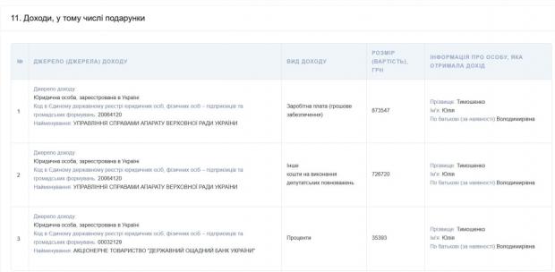 Отже, на місяць Тимошенко заробляла в середньому 72 795 грн. Крім того, торік вона отримала 726 720 грн на виконання депутатських повноважень.