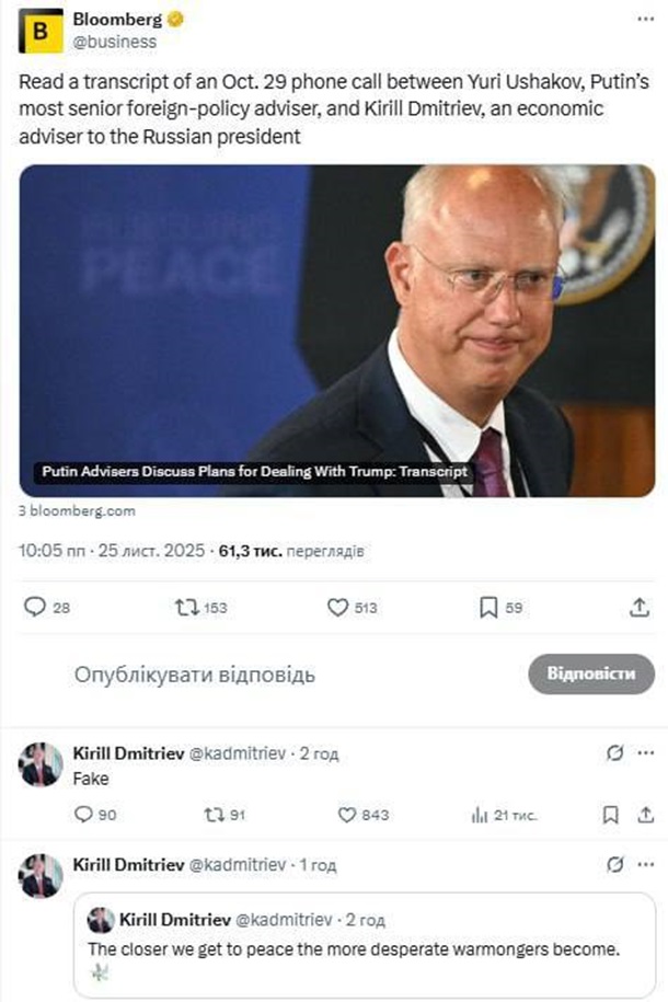 Перед цим видання навело розшифровку двох приватних розмов – радника Путіна Юрія Ушакова із спецпосланником Трампа Стівом Віткоффом. У ньому Віткофф радить Ушакову, як представити Трампу російські пропозиції "мирного плану". У другій розмові Ушаков і Дмітрієв обговорювали схему передачі російського варіанту "мирного плану" команді Трампа з метою, щоб американська сторона представила ці напрацювання як власний документ.