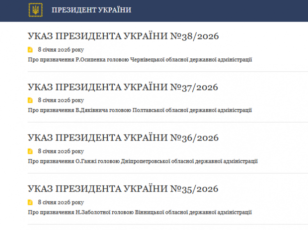 6 січня глава уряду Юлія Свириденко повідомила, що Кабмін вніс подання президенту Володимиру Зеленському про призначення нових голів Вінницької, Дніпропетровської, Полтавської та Чернівецької обладміністрацій.