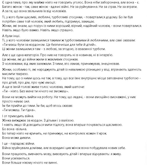 Психологиня наголосила, що мова не про щасливі родини, а про тих, хто роками жив під тиском і приниженням. За її словами, для таких жінок вимушений виїзд за кордон став шансом почати нове життя. «Жінка виїжджає за кордон. З дітьми і з валізою. І навіть якщо їй доводиться мити підлогу, вона вперше почувається щасливою. Бо вона – вільна», – зазначила авторка.