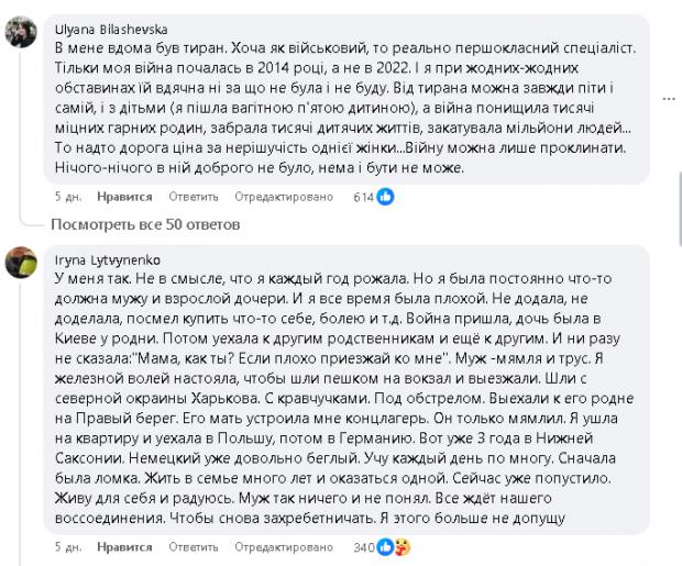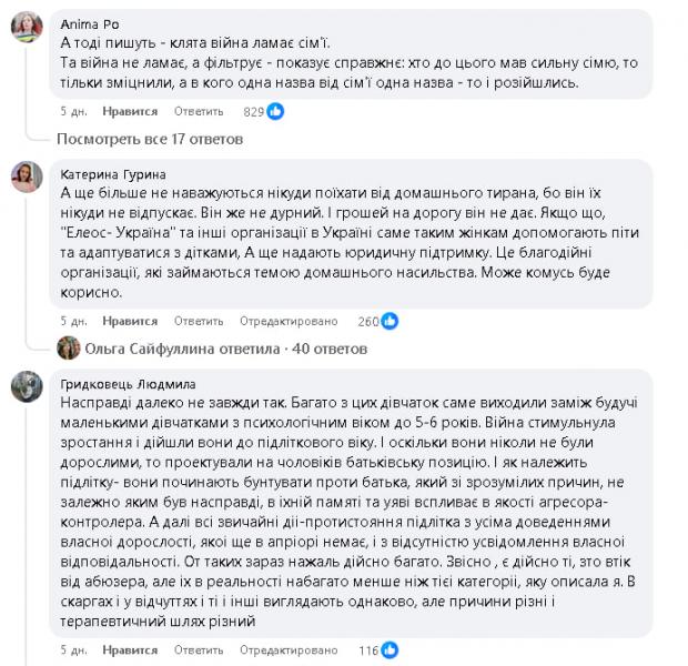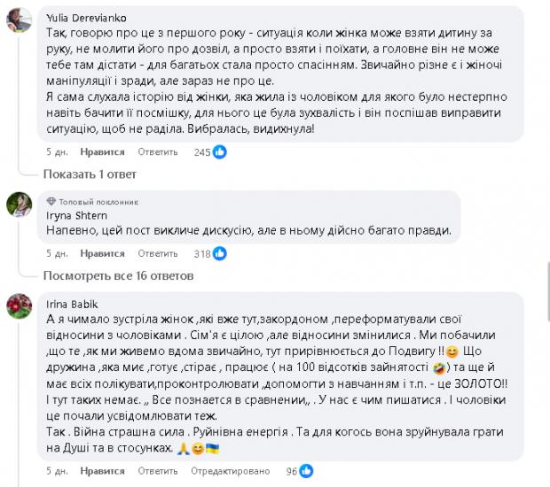 Більшість коментарів підтримують пост Ольги Сайфулліної – Оксана Венгер, Viktoriia Vyshynska, Anna Dubrovna та Kateryna Hymon відзначають його правдивість і відображення реального досвіду жінок: «Дуже сильний і правдивий текст, як на мене», «Зрозуміє тільки та, яка пройшла через це все. 100% правда!», «Чудовий пост. Влучний», «Війна для багатьох стала вікном можливостей. Пост правдивий, тема важлива».
