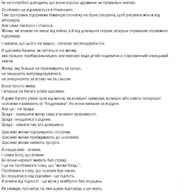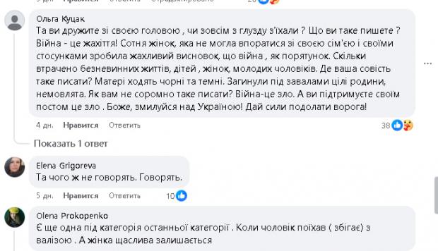 Ольга Куцак різко критикує текст, вважаючи його морально нетактовним: «Та ви дружите зі своєю головою , чи зовсім з глузду з'їхали ? Що ви таке пишете ? Війна – це жахіття! Сотня жінок, яка не могла впоратися зі своєю сім'єю і своїми стосунками зробила жахливий висновок, що війна , як порятунок. Скільки втрачено безневинних життів, дітей , жінок, молодих чоловіків. Де ваша совість таке писати? Матері ходять чорні та темні. Загинули під завалами цілі родини, немовлята. Як вам не соромно таке писати? Війна – це зло. А ви підтримуєте своїм постом це зло . Боже, змилуйся над Україною! Дай сили подолати ворога!».