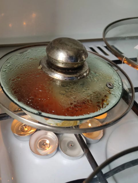 На фото – невеликі свічки. Авторка блогу оточила ними тарілку з їжею, яку поставила на газовий пальник плити. Зверху вона прикрила все великою скляною кришкою. "Якщо комусь цікаво – як, то ось так я грію воду без світла й газу. Так і гречка готується з овочами, спробую пізніше ще рис і макарони", – написала блогерка.