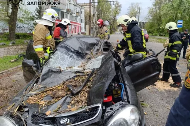 Через сильні пориви вітру дерево впало на легковий автомобіль, у якому перебував водій.