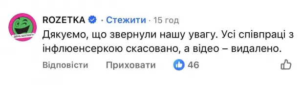 "Усі співпраці з інфлюенсеркою скасовано, а відео - видалено", - написали в маркет-плейсі Rozetka.