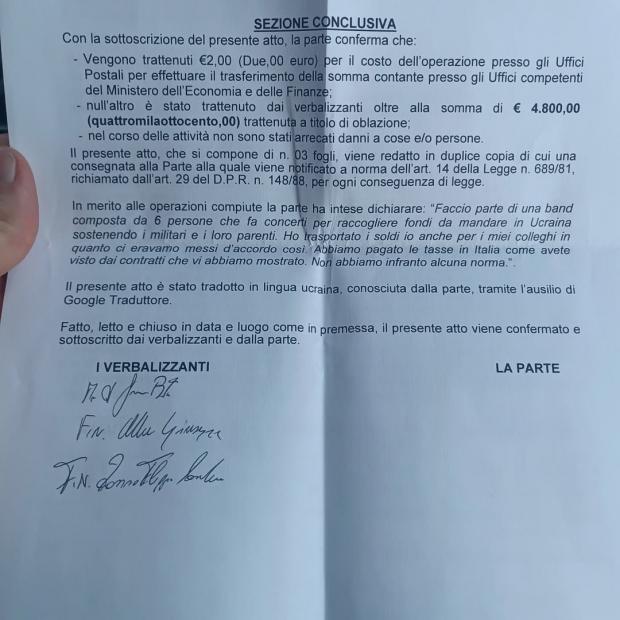 Артисти пояснили поліції, що ці гроші призначені для дронів, медикаментів або авто для армії України, але на них це не подіяло і кошти були вилучені. «Ми сподіваємося, що 4800 євро, які у нас зібрала Фінансова гвардія Італії, допоможуть їм упевнено продовжувати свою роботу та почуватися задоволеними. Але я хочу, щоб ви знали – ваші люди зовсім неправі», – заявили учасники гурту та подякували тим, хто робив донати.