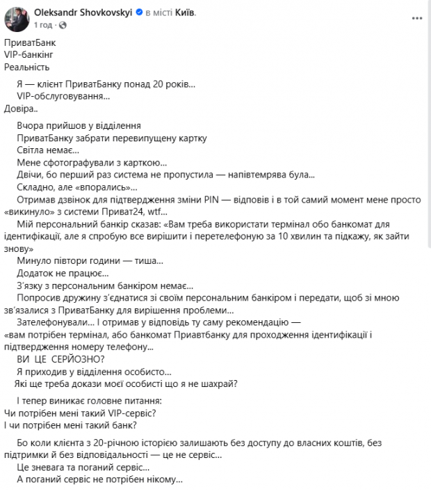 «Ви це серйозно? Я приходив у відділення особисто. Які ще треба докази моєї особисті що я не шахрай? І тепер виникає головне питання: Чи потрібен мені такий VIP-сервіс? І чи потрібен мені такий банк? Бо коли клієнта з 20-річною історією залишають без доступу до власних коштів, без підтримки й без відповідальності – це не сервіс. Це зневага та поганий сервіс. А поганий сервіс не потрібен нікому», – підсумував Шовковський.