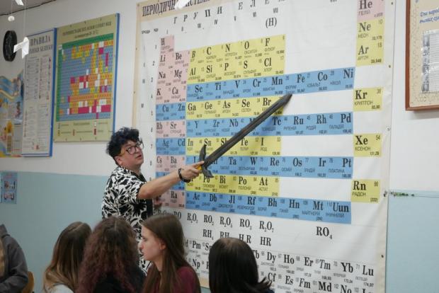 Біля столу – гільза, яку чоловік придбав на аукціоні, а поруч – великий меч, який він використовує, як указку. «У дев'ятому класі в нас є класична тема, коли ми вивчаємо спирти та їхню шкідливість. Я дітям пропоную знайти лайфхаки, як пити й не п'яніти. І починаю пояснювати, як впливає кожен з них. Вони мають розуміти не просто, що це – зло, а чому. Завдання хіміка: пояснити, як воно працює. І паралельно я їм пояснюю, як його добувають в промислових межах. Ми ставимо бражку, настоюємо, є апарат, в дистиляції ми отримуємо там п’ять мілілітрів того спирту, і вони розуміють, як цей процес виходить», – говорить вчитель Юрій Пахомов.