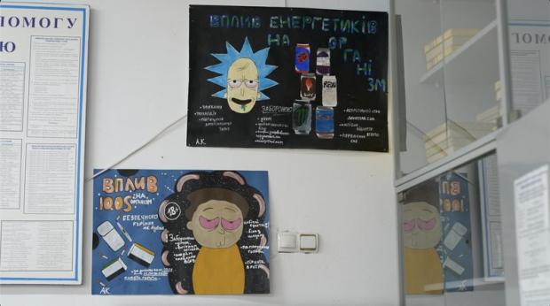 На вході у кабінет хімії висять плакати із персонажами мультфільму «Рік і Морті», які пояснюють шкідливий вплив куріння та енергетиків на організм людини.