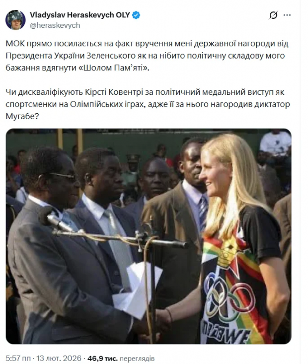 «МОК прямо посилається на факт вручення мені державної нагороди від Президента України Зеленського як на нібито політичну складову мого бажання вдягнути „Шолом Пам’яті“. Чи дискваліфікують Кірсті Ковентрі за політичний медальний виступ як спортсменки на Олімпійських іграх, адже її за нього нагородив диктатор Мугабе?» — написав Гераскевич у X, опублікувавши фото Ковентрі, яка тисне руку диктатору.