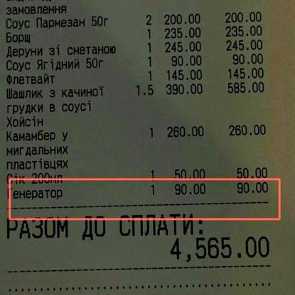 Уявіть: ви сідаєте за столик, замовляєте деруни зі сметаною, шашлик з качиної грудки чи камамбер у мигдальних пластівцях… і раптом бачите у своєму чеку рядок «Витрати на генератор — 90 грн». Саме такий несподіваний «бонус» зафіксував відвідувач одного ...