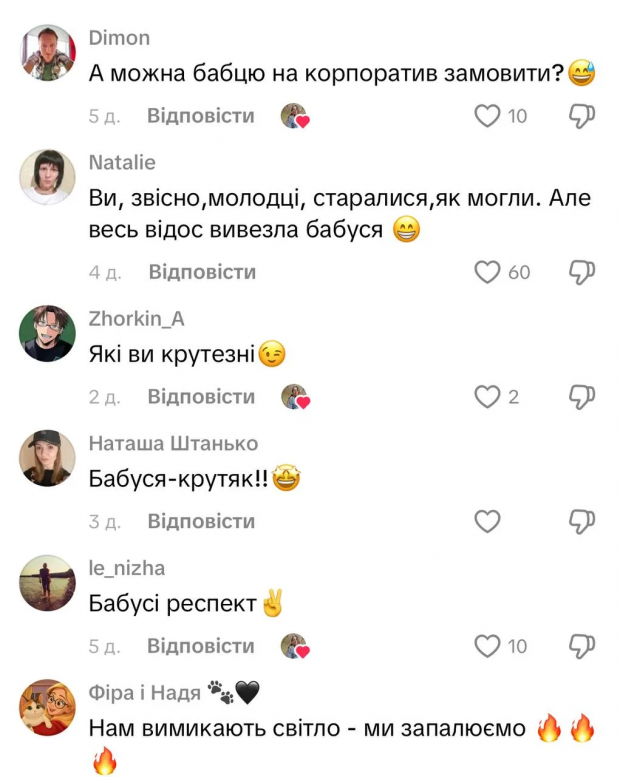 Понад 90 тисяч користувачів оцінили ролик, вісім тисяч залишили вподобайку і ще багато коментарів. Найбільше українцям сподобалась бабуся, яка енергійно запалювала під музику. «А можна бабцю на корпоратив замовити?», «ви, звісно старались як могли, але весь відос вивезла бабуся», «які ви крутезні», «бабуся взагалі родзинка програми», «бабуся респект», — пишуть коментатори.