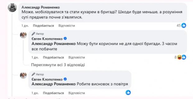 У публікації Клопотенко заявив, що розпочав розроблення збірника рецептів під назвою "Готуємо до бою", ініціатором створення якого стала Агенція оборонних закупівель Державного оператора тилу Міністерства оборони України. "Може, мобілізуватися і стати кухарем у бригаді? Шкоди буде менше, а розуміння суті предмета почне з'являтися", – відреагували в коментарях.