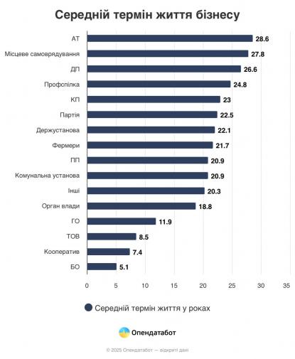ТОВ у середньому доживали до 8,5 років перед тим, як закритися, передають Патріоти України. Найчастіше компанії зникали у Києві, на Дніпропетровщині та Львівщині. Найбільше постраждали громадські організації: середній вік їхнього існування — 11 років. ...