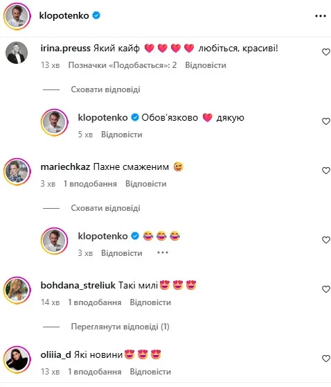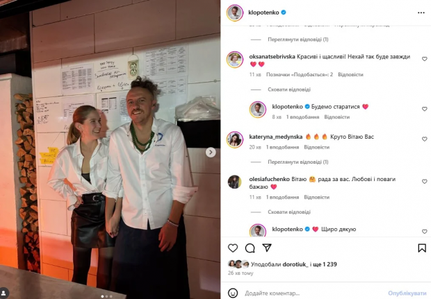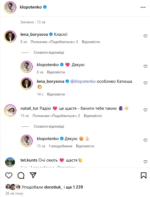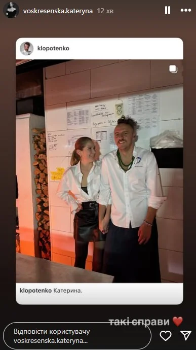Катерина Воскресенська в Stories також поділилася фото з Клопотенком. «Такі справи», — написала вона і додала емодзі сердечко. У коментарях під фото Клопотенка і Воскресенську засипали компліментами. «Класні», — написала рестораторка і бізнесвумен Олена Борисова. «Радію, це щастя — бачити тебе таким», — додала журналістка Наталя Тур. «Катя вітаю», — зазначила Леся Нікітюк.