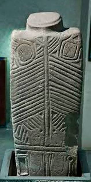 Усі чотири сторони стели вкриті рельєфними зображеннями. На звороті розміщене так зване дерево життя, на лопатках — символи Сонця та Місяця. Окрему увагу дослідників привертають сцени полювання з двома собаками, сакральні композиції, а також рідкісні зображення інструментів коваля-металурга — ложки для розливу металу та форми для лиття міді.